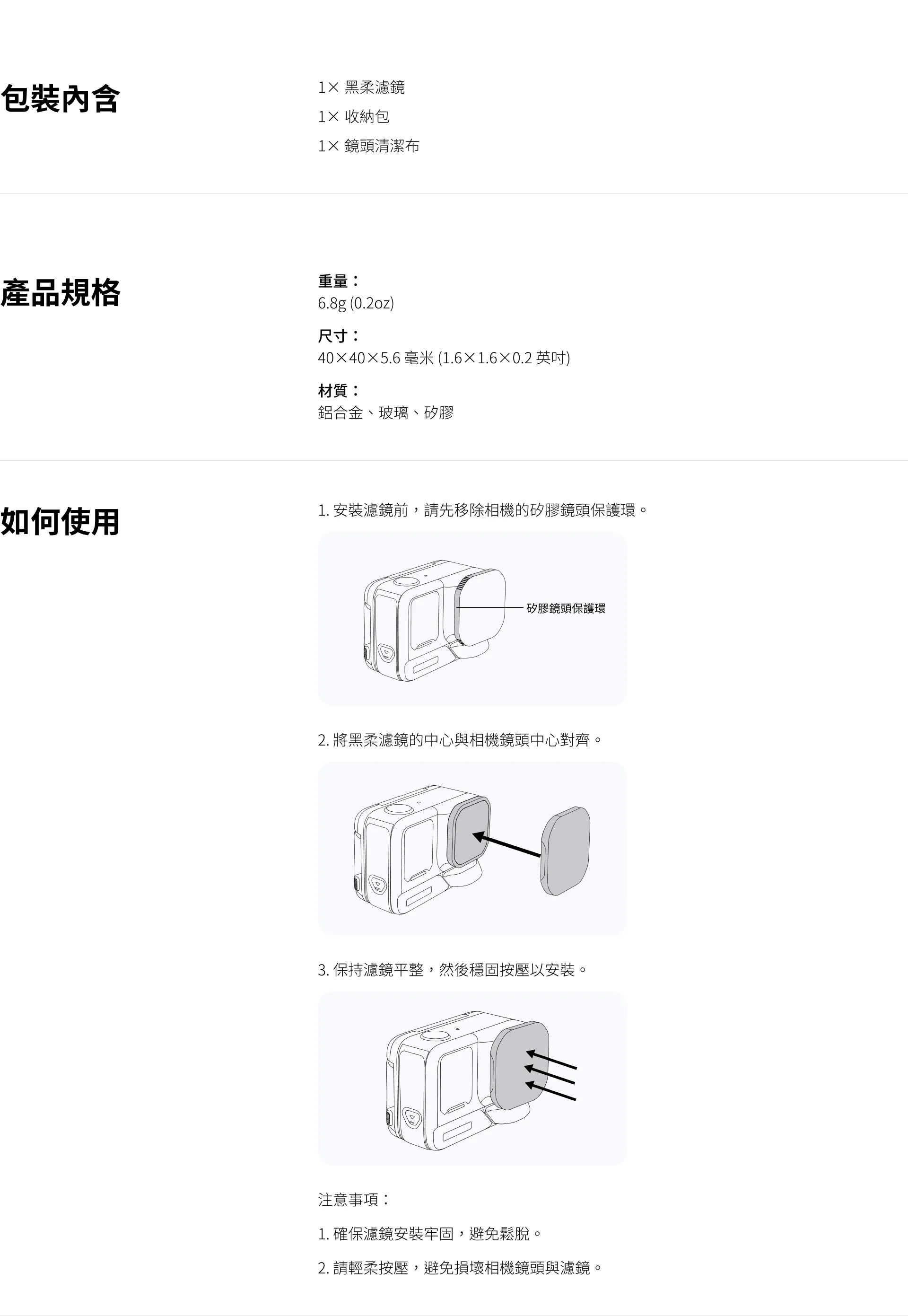 仔細檢查濾鏡和相機鏡頭,確保兩者清潔、乾燥。 如有需要,請使用清潔布進行清潔。 請在潔淨乾燥的環境中安裝濾鏡,鏡頭或濾鏡表面的任何異物都可能影響成像效果。