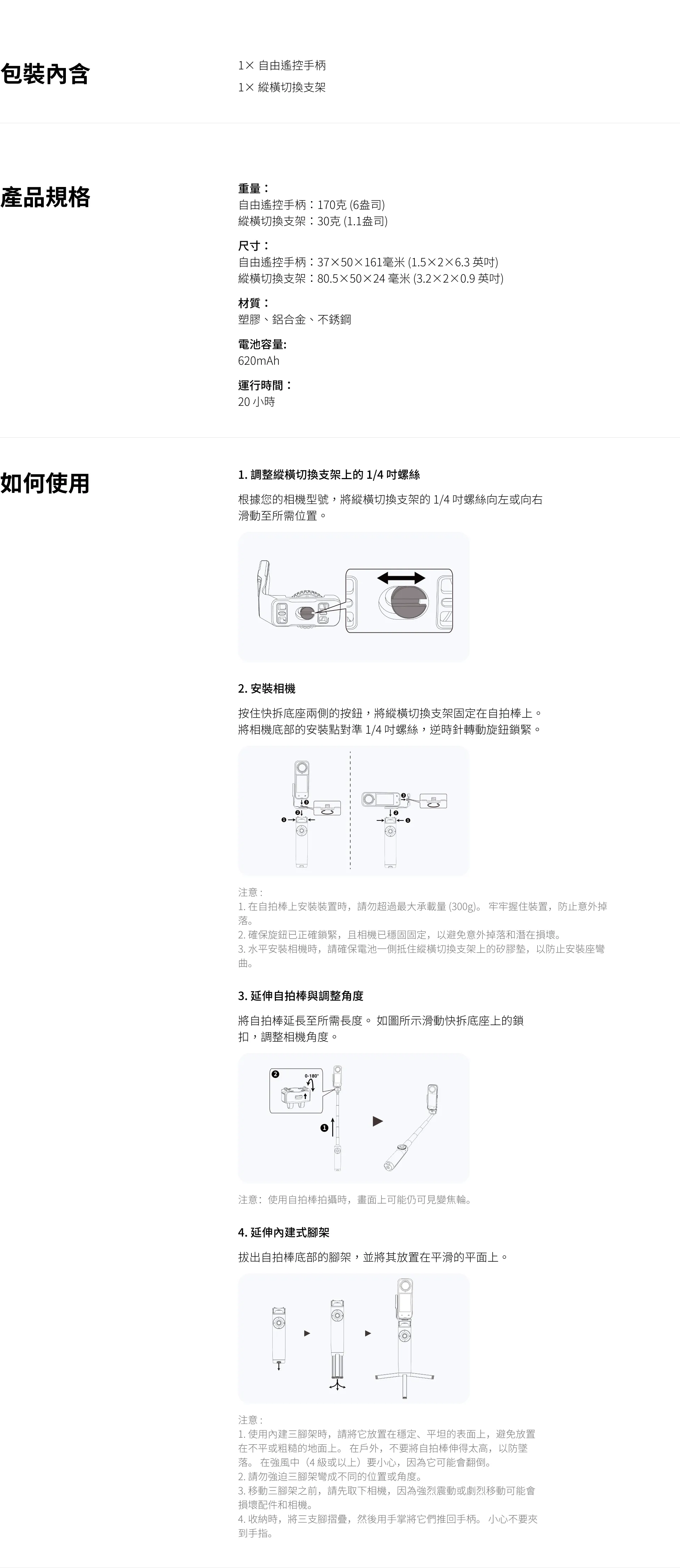 9. 縱橫切換支架和自拍棒包含磁鐵。 請遠離心律調整器和其他裝置,以避免干擾。