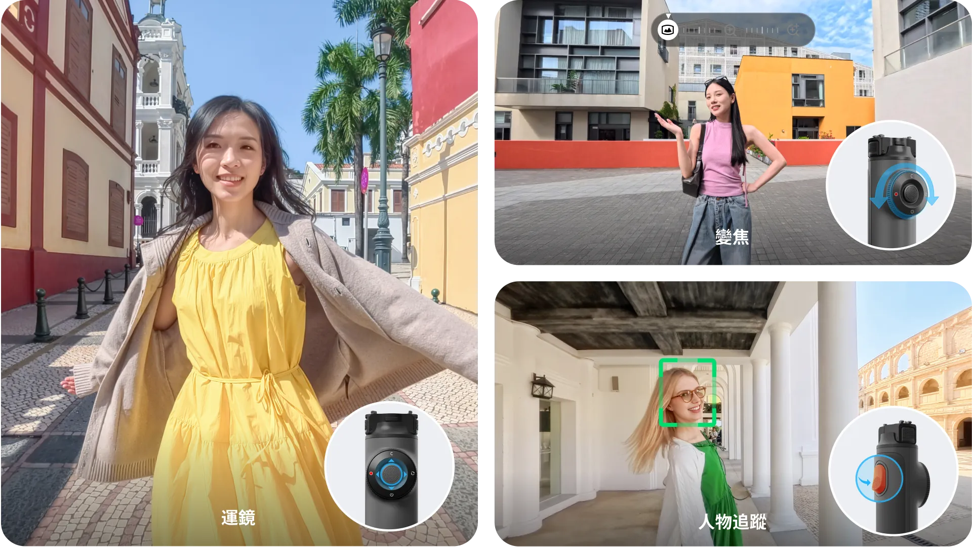 在動態跟拍2.0模式下,透過自由遙控手柄可進行運鏡、變焦、人物追蹤等各種豐富控制,無需觸控相機,拍攝體驗更加輕鬆流暢。