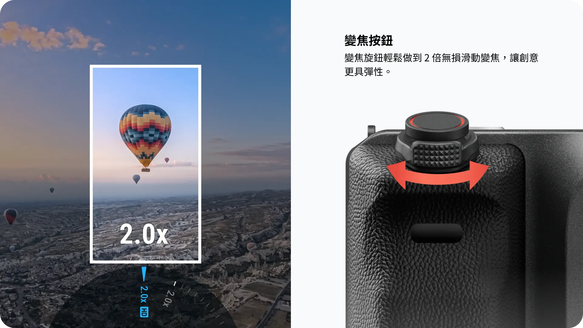 可透過手柄直接實現相機快門控制、 1-2 倍無損變焦、曝光控制、模式切換等功能。